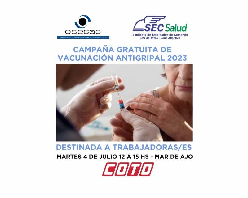Continuamos con la "Campaña Gratuita de Vacunación Antigripal 2023" en el Supermercado Coto, nuestro equipo va a vacunar el martes 4 de julio, en el horario de 12 a 15hs, en la ciudad de Mar de Ajó.