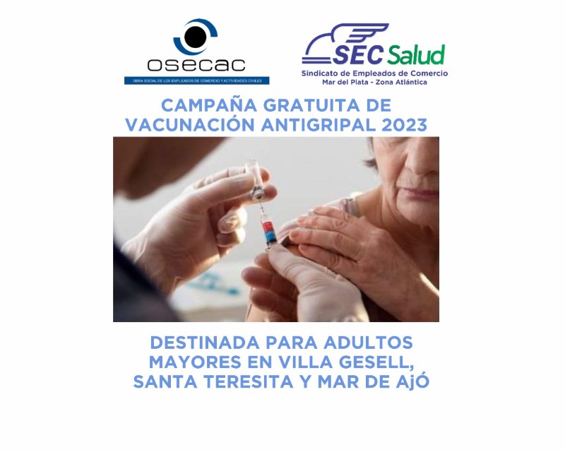 El Sindicato de Empleados de Comercio informa a través de la Secretaria del Interior que continuamos con la "Campaña Gratuita de Vacunación Antigripal 2023" destinada a adultos mayores y pacientes de riesgo. En la Delegación de Mar de Ajo estaremos vacunando, el día miércoles 17 de mayo en el horario de 12 a 13hs. En la Delegación Villa Gesell, el día miércoles 17 de mayo en el horario de 15 a 16hs y en la Delegación de Santa Teresita el miércoles 17 de mayo de 10 a 11.30hs.