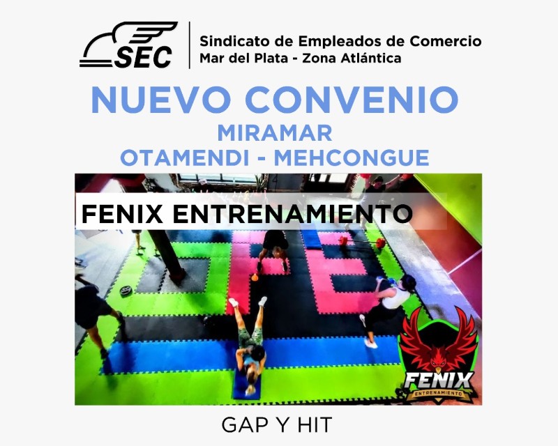 La Secretaría del Interior informa que se realizo un nuevo convenio para los afiliados y familiares a cargo al sindicato, en esta oportunidad con "FENIX ENTRENAMIENTO" Gap y Hit, con domicilio en Calle 19 nº 1601 en la ciudad de Miramar. Para más información y retirar tu bono en la Delegación de Miramar. Dirección: Calle 21 n° 1749. Teléfono: (2235) 067832. Whatsapp: 02291-423009. Mail: secamiramar@hotmail.com. Horarios de atención: Lunes a Viernes de 8 a 16hs