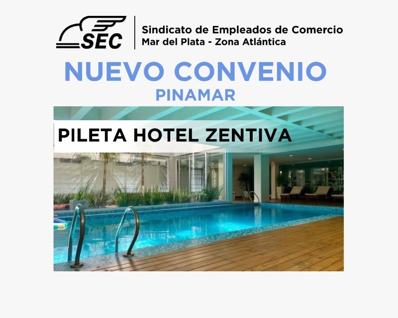 El Sindicato de Empleados de Comercio informa a través de la Secretaría del Interior que se realizó un nuevo convenio, en esta oportunidad en la ciudad de Pinamar, PILETA, en el "HOTEL SPA ZENTIVA" Av. Jorge Bunge 1595. Para afiliados al sindicato y familiares a cargo. Para más información y retirar tu bono en la Delegación de Pinamar. Dirección: Rivadavia 1970. Teléfono: (2254) 483331 / (2254) 493093. Whatsapp: 2267-535624. Horarios de atención: Lunes a Viernes de 8 a 16hs