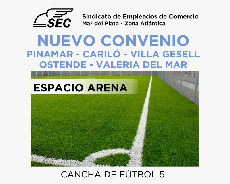 La Secretaría del Interior sigue sumando nuevos convenios para los afiliados y familiares a cargo al sindicato, en esta oportunidad con "ESPACIO ARENA" CANCHA DE FÚTBOL 5, con domicilio en Av. Espora 1715 en Valeria del Mar. Para más información y retirar tu bono en la Delegación de Pinamar. Dirección: Rivadavia 1970. Teléfono: (2254) 483331 / (2254) 493093. Whatsapp: 2267-535624.